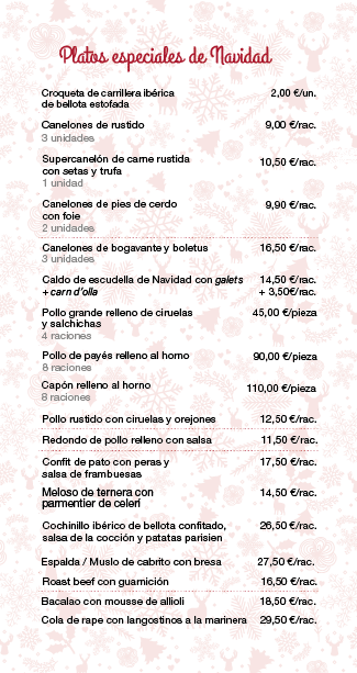 Este año podréis escoger entre 18 platos originales, navideños y sobre todo riquísimos. Hechos con nuestros mejores productos y todo nuestro cariño. Hemos hecho lo que más nos gusta: mezclar la tradición con un toque creativo e innovador. Desde los típicos, como el caldos de «escudella con galets» o los tradicionales canelones hasta platos 100% de luxe como el meloso de ternera con parmentier de celerí. ¡Tenéis de todo para escoger!