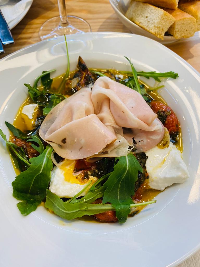 Burrata con tomates cherry confitados a la mediterránea, mortadela trufada y rúcula, acompañada de focaccia  |
